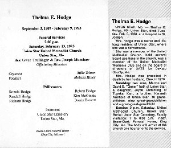 UNION STAR, Mo. — Thelma E. Hodge, 85, Union Star, died Tuesday, Feb. 9, 1993, at a hospital in St. Joseph.